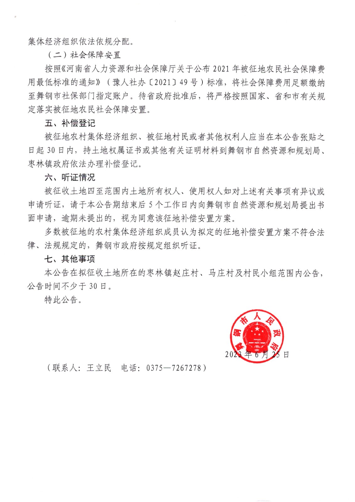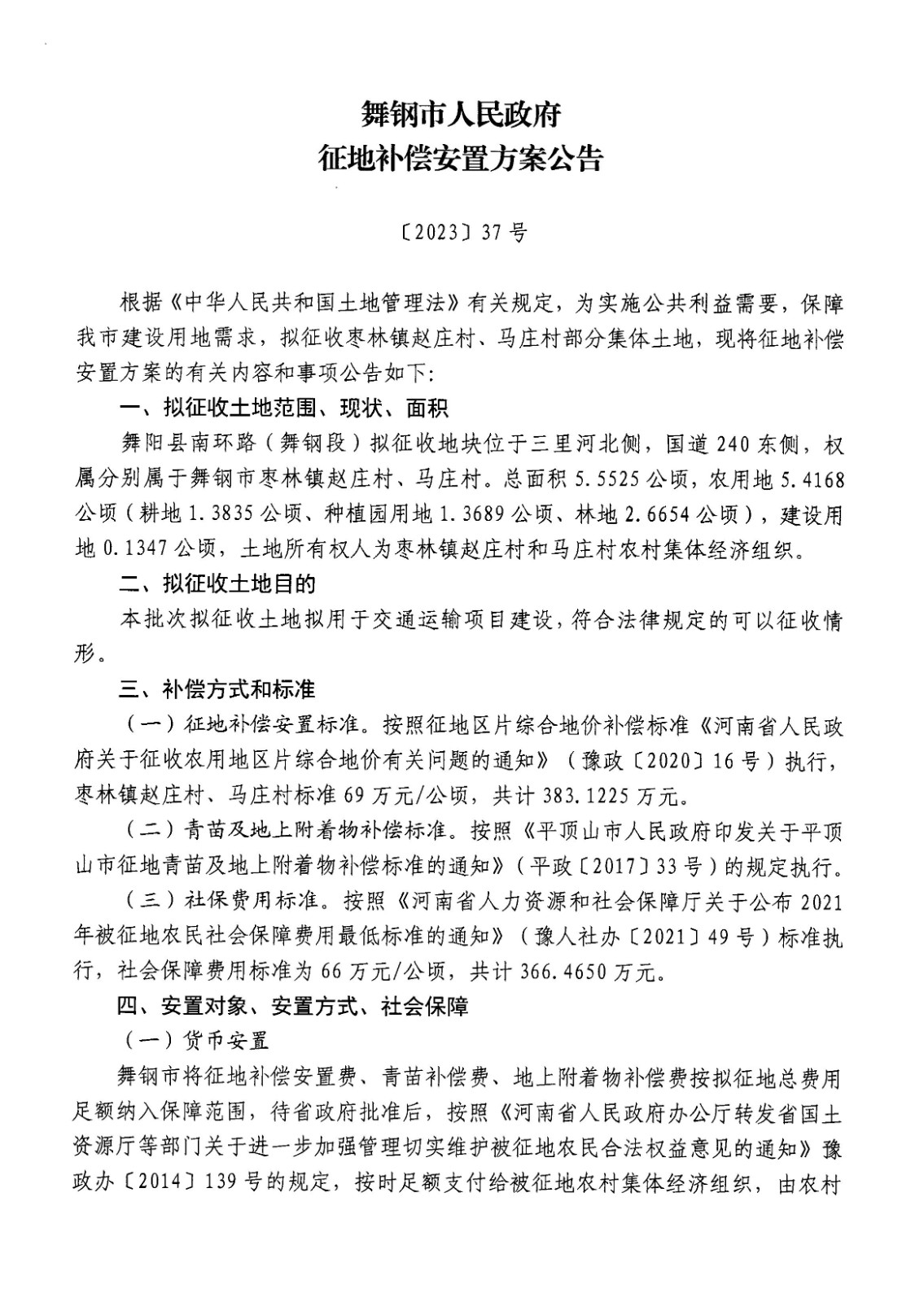 舞钢市人民政府征地补偿安置方案公告(舞阳南环路)