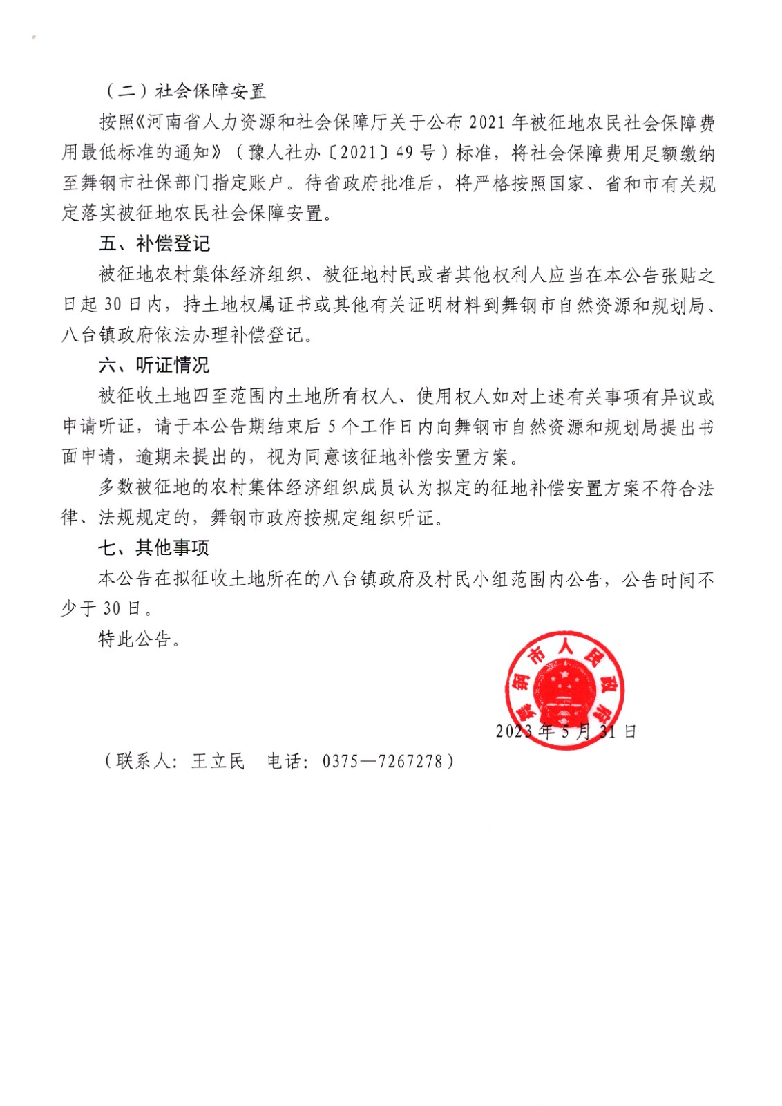 舞钢市人民政府征地补偿安置方案公告(八台镇杨泉村)