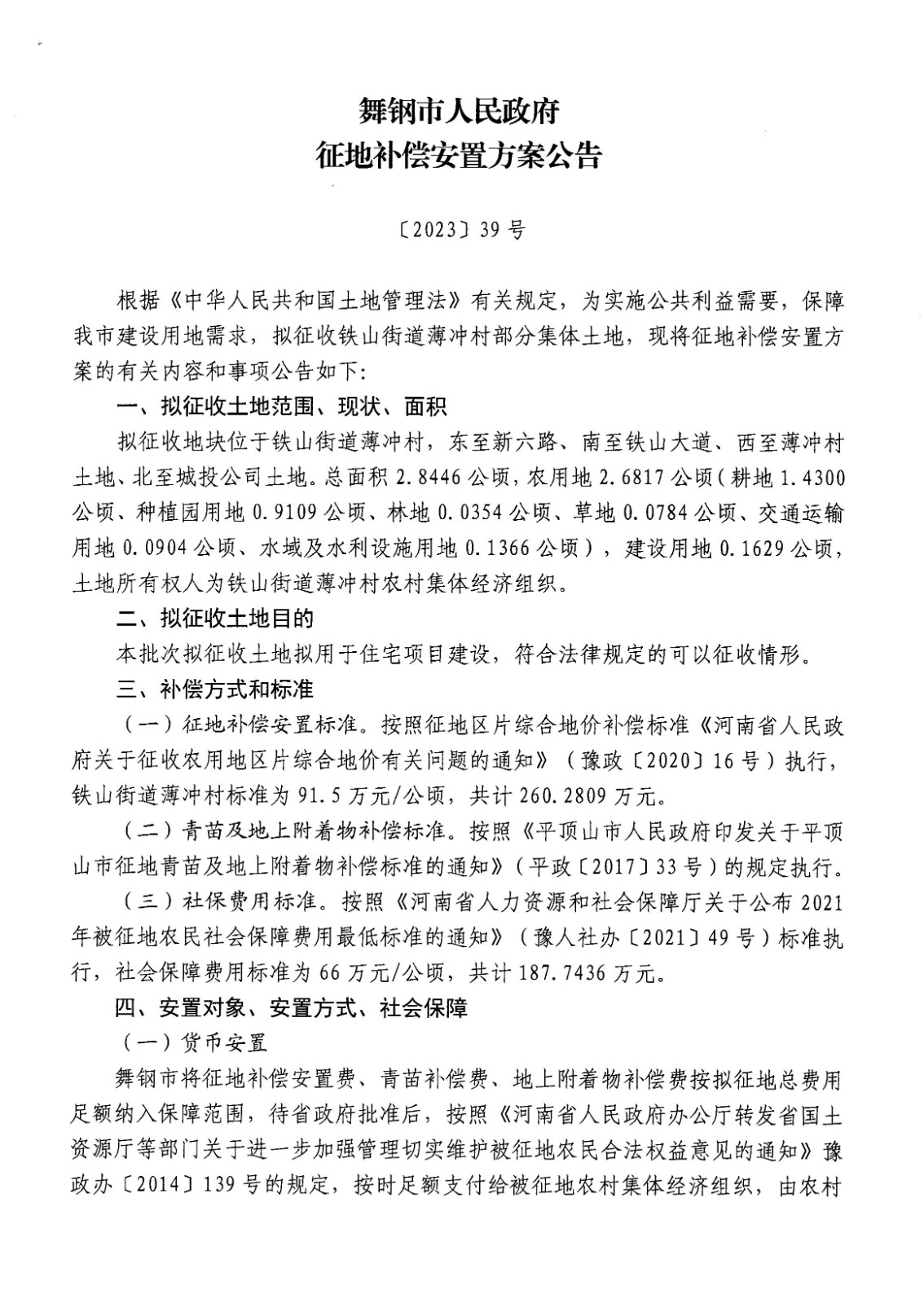 舞钢市人民政府征地补偿安置方案公告(铁山街道薄冲村)