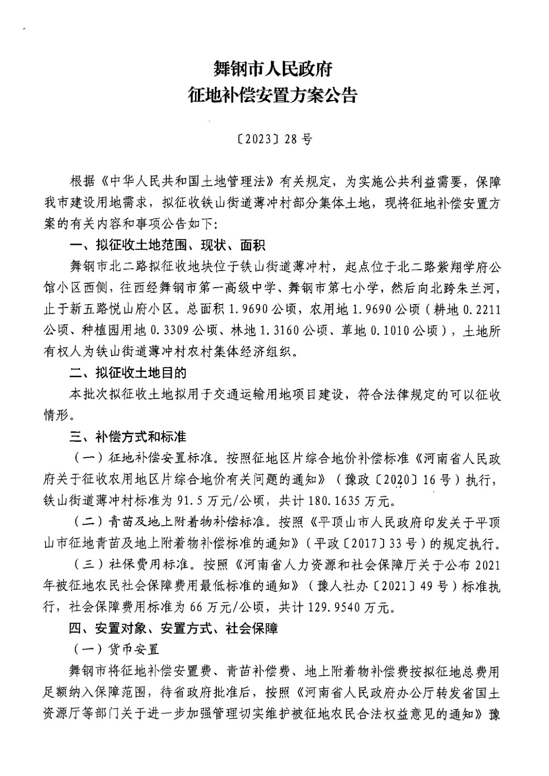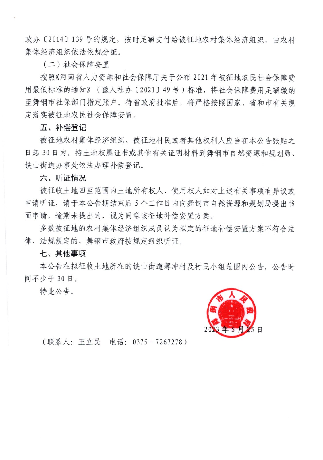 舞钢市人民政府征地补偿安置方案公告(铁山街道薄冲村)