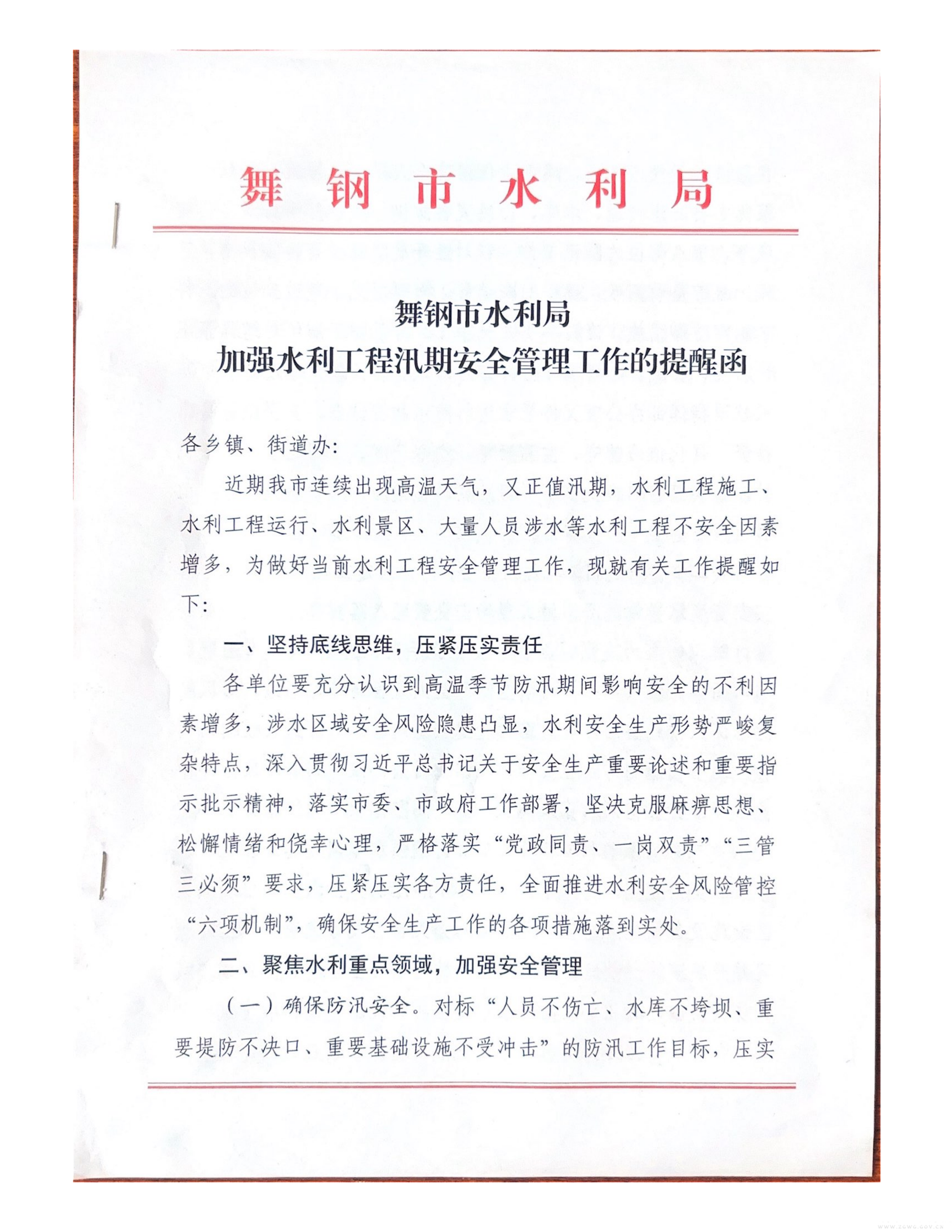 舞钢市水利局加强水利工程汛期安全管理工作的提醒函